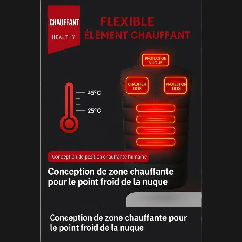 • Riscaldamento distribuito su zona dorsale: Elementi termici posizionati su schiena forniscono calore localizzato durante utilizzo in stagioni fredde