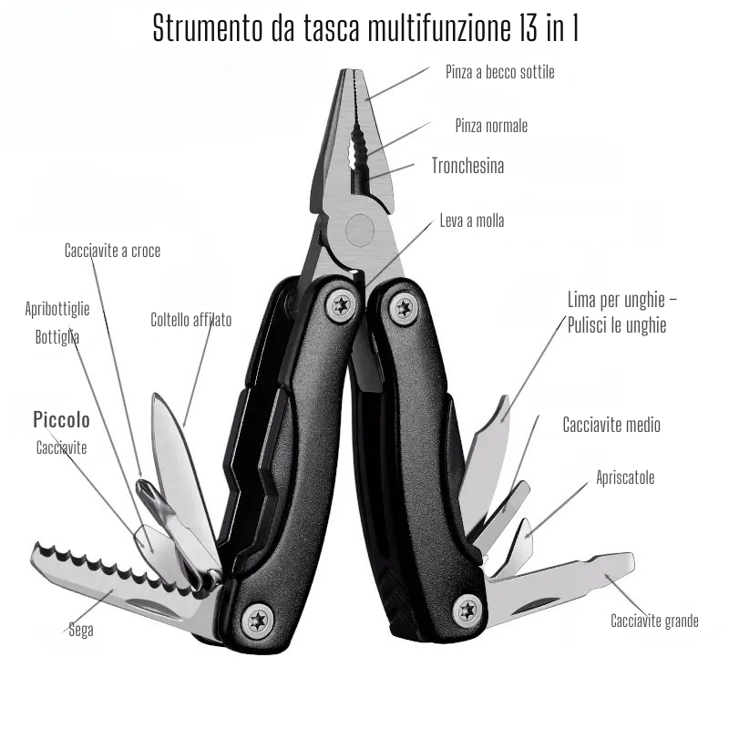• Strumenti tattici multifunzione: Include coltello, sega a cavo, pinza multifunzioni, carta attrezzi, penna tattica, asta telescopica e corda resistente con moschettoni