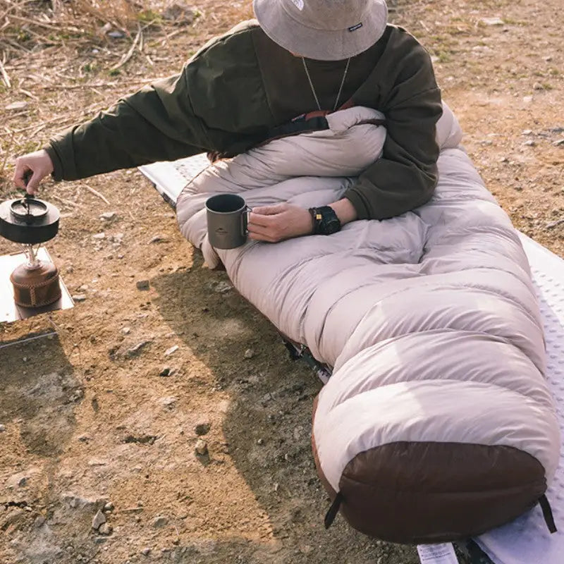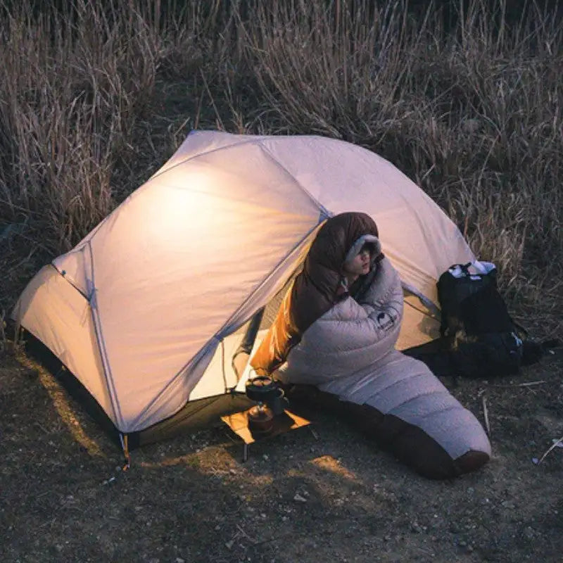 QuestoSacco a pelo invernale estremo è progettato per il campeggio e l'escursionismo con tempo fresco. Fabbricato in nylon 20D, offre un comfort ineguagliato durante le notti passate all'esterno. La sua forma a mummia, con l'imbottitura in piume d'anatra mantiene un calore vitale anche con temperature negative. Altamente performante e comprimibile, questo sacco a pelo di alta gamma è il vostro miglior alleato per il campeggio e le escursioni invernali.