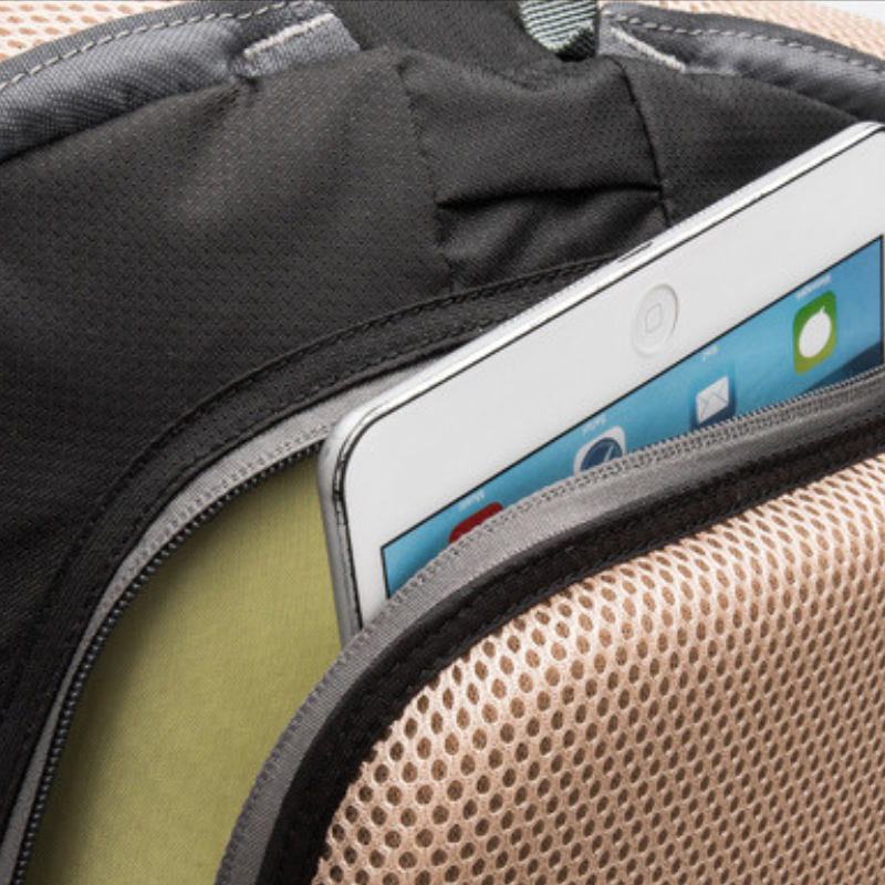 • Tasca posteriore antifurto lato corpo: Scomparto nascosto per oggetti di valore con cerniere SBS e porta cuffie integrato